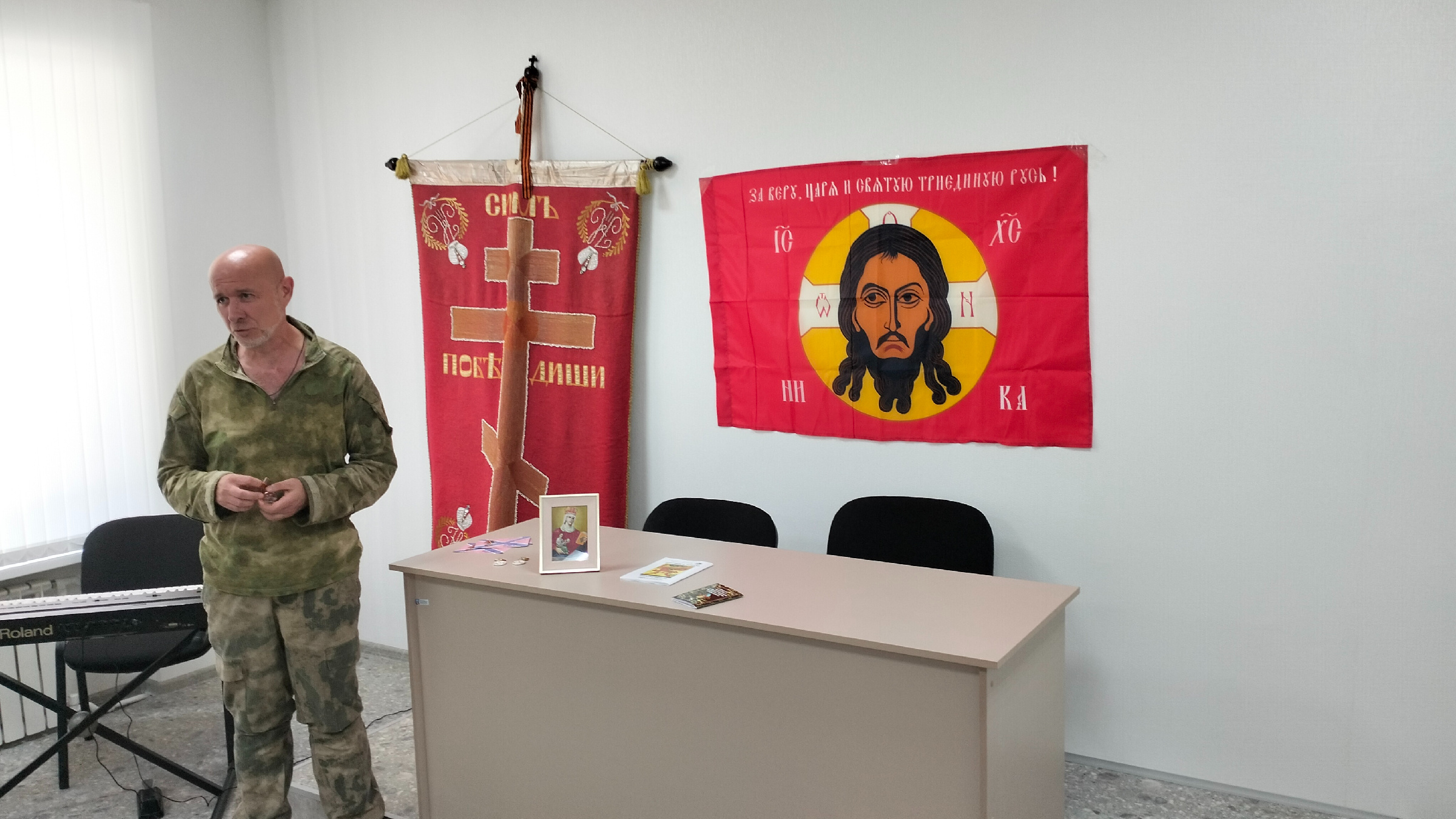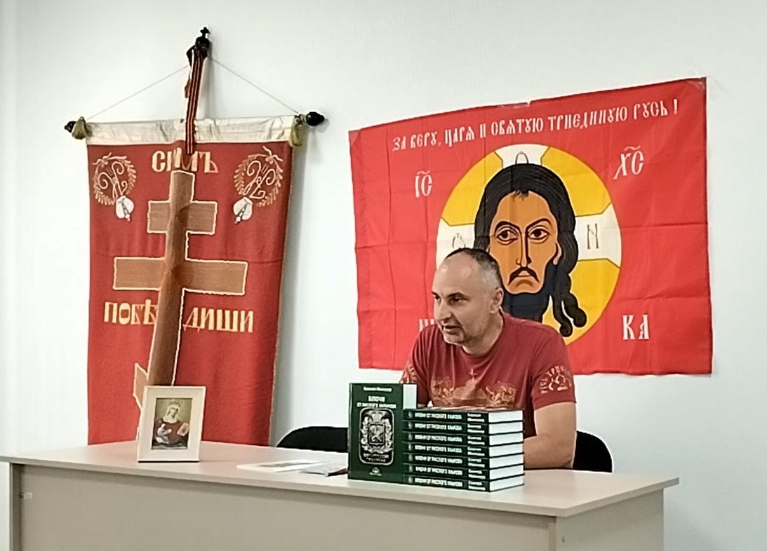 Я в свою очередь вручил смысловые подарки Александру Анатольевичу Белоконь, атаману Мариупольского округа СКВРиЗ, руководителю коллектива народного танца «Первоцвет»: свою книгу, нашу футболку «Руси Триединой» с имперским орлом, шевроны и флаг с Образом Спаса Нерукотворного.